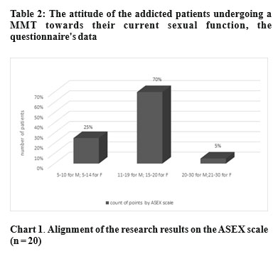 A significant number of patients treated for heroin addiction suffer from sexual disorders. The aim of this research was to investigate the sexual function of the heroin addicted patients taking a methadone maintenance treatment (MMT), to identify the types of sexual disorders and analyse their causes. Methods: Questionnaire, scale ASEX and WHO-ASSIST V3.0 were performed by 20 sexually active patients (15 men and 5 women), undergoing MMT. Results: The data of the questionnaire have shown that 55% of the patients suffer from deterioration of their sexual function, 30% of the patients have observed the improvement of their sexual function, and 15% of the patients have not felt any changes. The patients with a worsened sexual status have taken higher daily dosage of methadone (66, 8 ± 24,11 mg). 40% of the patients have expressed the anxiety caused by the disturbance of their normal sexual function, it being known that the duration of their treatment was longer and the dosage of methadone was higher (p ˃ 0,05). According to ASEX scale, the men scored 14,13 ± 2,85 Likert points, and the women - 15,6 ± 2,88 Likert points; 5 patients (25%) have not had any sexual disorders, 4 patients(70%) have observed some disorders of their sexual functioning, and only one patient (5%) has suffered from sexual dysfunction. In general, a fade of the sexual desire (3, 25 ± 1,06 Likert points) and problems with achieving orgasm (3,0 ± 0,85 Likert points) were noticed, but the experienced orgasm was satisfactory (2,6 ± 0,99 Likert points). The patients showing relatively good indicators for the libido (2.5 Likert points), the arousal (2.3 Likert points), the satisfaction with orgasm (2,0 Likert points) took 40-50 mg of methadone per day. A marked decrease of the sexual desire, the disturbance of the ejaculatory function (3.5 Likert points), the dissatisfaction with orgasm were noted at the dosage of 80- 100 mg of methadone per day. Conclusions: The methadone has an effect on the sexual function. High doses suppress the sexual desire, delay the ejaculation and prevent the achievement of orgasm, the average doses do not lead to obvious sexual disorders caused by the abuse of heroin.