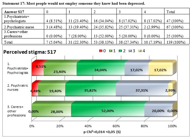 There were big differences in aswering to the statetment „Most people would not employ someone they knew had been depressed” square Chi test being p=0,014<0,05, especially among the distribution of answers for the carers and other professions group and the other two subgroups. The highest perceived stigma we found in the nurses subgroup (40,30%) followed closely by psychiatrists and psychologists subgroup (34,04%). There is a significant but weak concordance between the personal stigma and the perceived stigma tau-b Kendall= 0,252 nad the personal stigma is lower than the perceived stigma in all three subgroups.